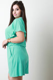 This plus size romper features a round neckline, short kimono sleeves, cinched waistline, side pockets, and open slit at back with button-loop closure. Accessories sold separately. Made in U.S.A. 96% Polyester, 4% Spandex.