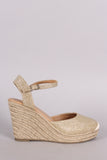 This shimmery round toe wedge features a glitter detail upper, braided espadrille platform wedge heel, lightly padded insole, and adjustable ankle strap with buckle closure.