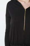 This hooded jersey jumpsuit features a zip-up front, elasticized waist with faux drawstring, and long sleeves. Also features a taper cut bottom with slits at the knees and side pockets. Accessories sold separately. Made in U.S.A. 87% Polyester, 9% Rayon, 4% Spandex.
