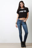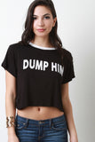 This cute crop top features a round neckline with contrast knit trim, "DUMP HIM" graphic print at front, short sleeves construction, and cropped hemline. Accessories sold separately. Made in U.S.A. 95% Rayon, 5% Spandex.