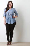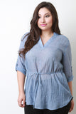 A breezy plus size chambray top featuring a v-neckline, cuffed three-quarter sleeves with button tab accent, and a self-tie cord at waist. Accessories sold separately. Made in USA. 100% Cotton.