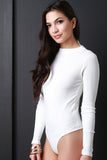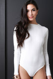 This bodysuit features a vertical pattern ribbed knit texture, seamless mock neckline, long sleeves, thong bottom, and a double snap button closure at crotch. Accessories sold separately. Made in U.S.A. 95% Rayon, 5% Spandex.