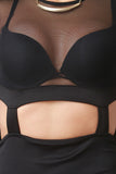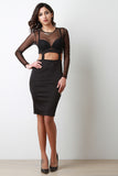 This  midi dress  features smooth stretch fabric, contrast semi-sheer mesh top, round neckline, long sleeves, cut out midriff design, and back zipper closure. Accessories sold separately. Made in U.S.A. 96% Polyester, 4% Spandex.