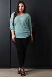 This plus size marled knit top features a round neckline, three quarter dolman sleeves design, and side cinched details. Top comes with a long geometric cutout pendant necklace with a curb chain tassel. Other accessories sold separately. 88% Rayon, 12% Polyester.