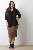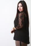 This gorgeous plus size blouse features a soft chiffon with semi-sheer floral lace fabrication, round neckline with tie neck, three quarter sleeves, elastic cuff, and curved hem. Accessories sold separately. Made in U.S.A. 100% Polyester. Contrast 92% Nylon, 8% Spandex.