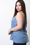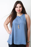 This silky plus size blouse features a round neckline, sleeveless construction, and a relaxed trapeze fit. Finished with a keyhole back and button closure at the nape. Accessories sold separately. Made in USA. 100% Polyester.