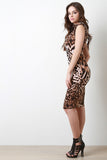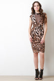 A leopard print pattern throughout, a mock neck, and semi-sheer mesh panels at the front and back. Finished with padded shoulders and short t-shirt style sleeves. Accessories sold separately. Made in USA. 95% Polyester, 5% Spandex.