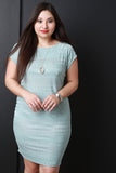 A plus size midi dress featuring a woven harlequin and stripes pattern throughout, short sleeves, and a strappy low back design. Accessories sold separately. Made in USA. 97% Polyester, 3% Spandex.