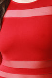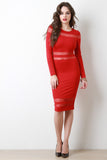 This midi dress features a round neckline, long sleeves, and semi-sheer mesh stripes. Finished with a back zipper closure. Accessories sold separately. 80% Cotton, 20% Spandex.