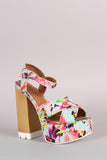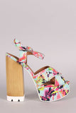 Qupid Floral X-Band Ankle Strap Faux Wooden Platform Heel