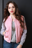 A lightweight bomber-style jacket featuring swishy wind-resistant fabric, elastic rib knit trim, and a zipper front. Jacket also features smooth interior lining, two side pockets with glossy snap button closures, and contrast color sleeves. The left sleeve features a zippered utility pocket accent. Accessories sold separately. 100% Polyester.