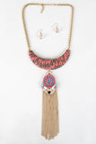 This statement necklace features a flat curb link chain main, woven chevron plate piece, and mixed acrylic gems pendant with chain tassel. Lead and nickel free.