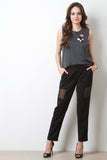 These pants feature solid main, semi-sheer mesh panel accents, two side pockets, partially elasticized waist, and taper cut. Accessories sold separately. Self: 97% Polyester, 3% Spandex. Contrast: 100% Polyester.
