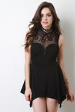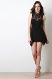 This dressy sleeveless lace yoke , and sweetheart bodice. Finished with a keyhole back, draping handkerchief mini skirt, and shorts under layer. Accessories sold separately. Made in USA. 96% Polyester, 4% Spandex.