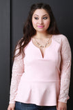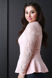 A floral lace long sleeves. Finished with flattering seams at the bodice. Top includes removable pearls and rhinestones necklace. Other accessories sold separately. Made in USA. 96% Polyester, 4% Spandex. Contrast: 92% Nylon, 8% Spandex.