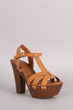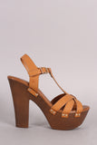 This platform chunky heel. It is t-strap construction with an adjustable ankle strap, featuring crossing straps at toe box. Finished with metallic studded hardware.