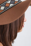 This panama hat features slight floppy wide brim and molded crown. Finished with an attached geometric design ribbon.