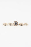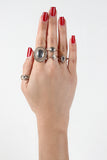 This set of five rings features a prominent faux gem ring, ladylike cuts on the smaller rings, and etched bezels. Bands are not adjustable.