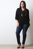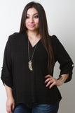 This plus size top features a textured knit fabrication, split v-neckline, long roll-tab sleeves, and high-low hemline. Accessories sold separately. Made in U.S.A. 100% Cotton.