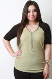 Zip Up Marled Knit Contrast Short Sleeves Top