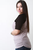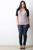 This  plus size top  features a marled knit fabrication with contrasting solid knit short raglan sleeves, v-neckline, zip up front, and side cinched detail. Accessories sold separately. Made in U.S.A. 97% Rayon, 3% Spandex.