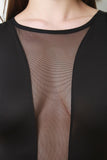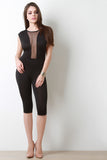 This short sleeve jumpsuit features a round neckline with a semi-sheer mesh throughout the middle front, open back design with an adjustable tie up, and finished with three quarter length pants. Accessories sold separately. Made in USA. 97% Polyester, 3% Spandex.