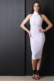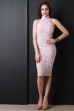 This midi dress features a semi-sheer fabrication with velvet filigree texture knit, sleeveless cutaway, turtle neckline, hidden zipper back, and a high waisted cinched seam. Made in U.S.A. Accessories sold separately. 95% Polyester, 5% Spandex.