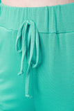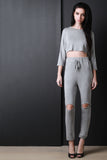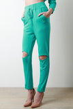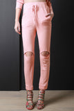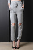 These soft terry cloth jogger style pants features a high waisted, wide elasticized waist, draw string d�cor, side pockets, knee cutout, and elasticized band hemline. Made in U.S.A. Accessories sold separately. 95% Rayon, 5% Spandex.