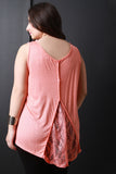 A lace panel. Finished with a high-low hemline. Accessories sold separately. Made in U.S.A. Self: 100% Rayon. Lace: 95% Polyester, 5% Spandex.