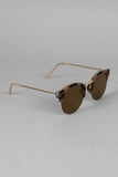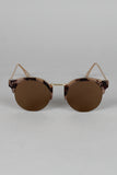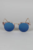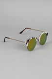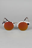 These sunglasses feature marbled effect semi-rimless design, round lenses, and metallic bridge.
