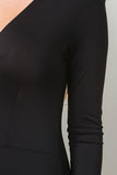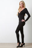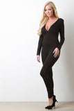 This long sleeve jumpsuit features a v-neckline, shoulder padding, and zipper fastener at back. Finished with bodycon mesh-like material and tapered legs. Accessories sold separately. Made in U.S.A. 97% Polyester, 3% Spandex.