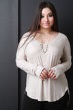 This plus size top features a ribbed knit fabrication with a high low hemline, round neckline and finished with long sleeves. Accessories sold separately. Made in US.A. 95% Rayon, 5% Spandex.