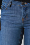 These denim jeans features a low rise waist, belt loops, classic 5-pocket design, zipper fly, single button closure, knee skirt, unfinished raw hemline, and stretchy taper fit. Accessories sold separately. 58% Cotton, 18% Rayon, 22% Polyester, 2% Spandex.