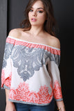 This off the shoulder top features an elasticized band, long bell sleeves, relax shift cut fit, and contrasting printed design finish. Accessories sold separately. 100% Polyester.