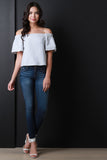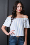 This bardot top features elasticized band at shoulder, short sleeves, crop hemline, and vertical stripes throughout. Accessories sold separately. 100% Cotton.