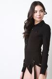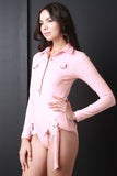 This bodysuit features a spread collar, decorative straps with metal d-ring accents, button up front, and finished with double button snap closure at crotch for easy on/off. Accessories sold separately. Made in U.S.A. 70% Rayon, 25% Nylon, 5% Spandex.