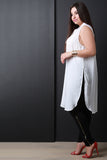 This plus size maxi top features a semi-sheer chiffon contrast stripe fabrication on the top area, collared neckline with a button up front, sleeveless and finished with deep side slits. Accessories sold separately. 100% Polyester.