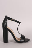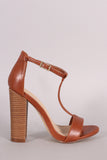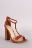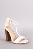 This heel features an open toe silhouette, t-strap construction, ankle strap with adjustable buckle fastening, and wrapped stacked heel.