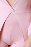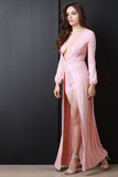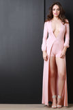 This jersey knit romper dress features a plunging v-neckline, long sleeves with elasticize hem, cinched seam waist, shorts bottom, and long maxi with vent opening at front. Accessories sold separately. Made in U.S.A. 95% Polyester, 5% Spandex.