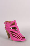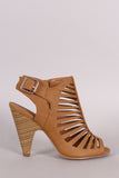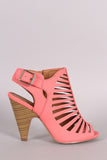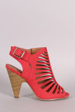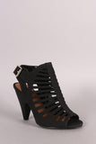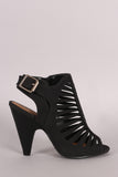 This strappy caged silhouette with an open back, featuring an adjustable side zipper. Finished on a kitten chunky stacked heel for comfort.