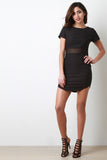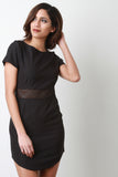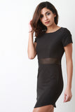 This casual chic dress features a round neckline, short sleeves, semi-sheer mesh mid-section, sculpture fit, rounded hemline, and zipper fastener at back. Accessories sold separately. 97% Polyester, 3% Spandex.