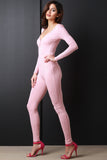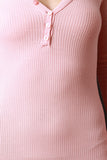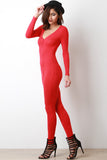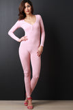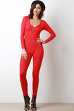 This ribbed knit jumpsuit features a v-neckline, button-up d�cor, long sleeves, and taper leggings. Accessories sold separately. Made in U.S.A. 95% Rayon, 5% Spandex.