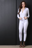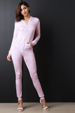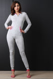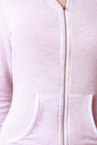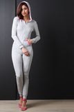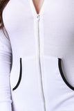 This lightweight jersey knit jumpsuit features a zip up front, hoodie back, long sleeves, jogger leggings, kangaroo pockets, and contrasting trimming at hood and pockets. Accessories sold separately. Made in U.S.A. 92% Cotton, 8% Spandex.