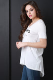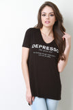This casual top features a v-neckline, "Depresso /de-pres-so/ the feeling you get when you've run out of coffee." graphic print at front, short sleeves construction, and jersey knit fabrication. Finished with a high low hemline. Accessories sold separately. Made in U.S.A. 95% Rayon, 5% Spandex.