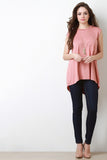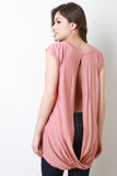 This jersey knit top features a twisted cutout design at the back, round neckline, short sleeves, single breast pocket, and high-low hemline. Accessories sold separately. 96% Viscose, 5% Spandex.