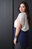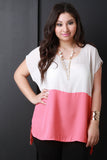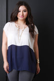 This tri-color plus size top features a round neckline, short sleeve construction, high low hemline and detachable necklace. Other accessories sold separately. 100% Polyester.