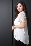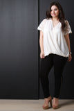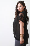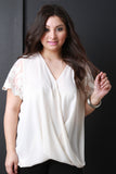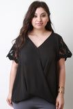 This  plus size top  features lightweight woven fabric, surplice front, v-neckline, crochet and semi-sheer mesh short sleeves, and slight high-low hem. Accessories sold separately. 100% Polyester.