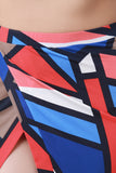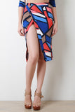 This unique midi skirt features an elasticized waist, geometric shapes throughout, high slit front, and an asymmetrical hemline. Accessories sold separately. 95% Polyester, 5% Spandex.