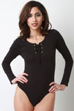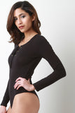 This jersey knit lace-up design on bust, long sleeves, and double snap button closure at crotch. Accessories sold separately. Made in U.S.A. 95% Cotton 5% Spandex.