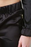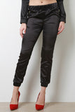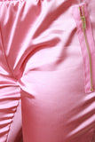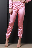 These comfy lightweight jogger pants feature smooth faux satin detail. Including an elastic band on the waist, elastic cuffs on the legs, and zipper pockets on both sides. Accessories sold separately. Made in U.S.A. 100% Polyester.